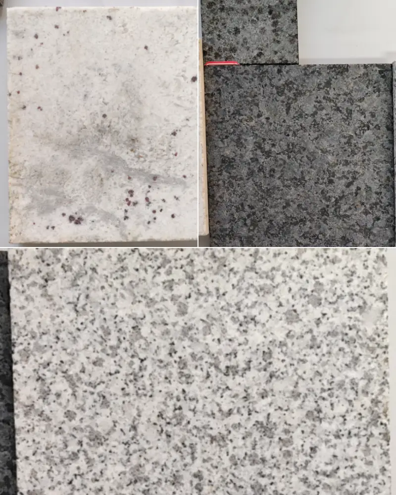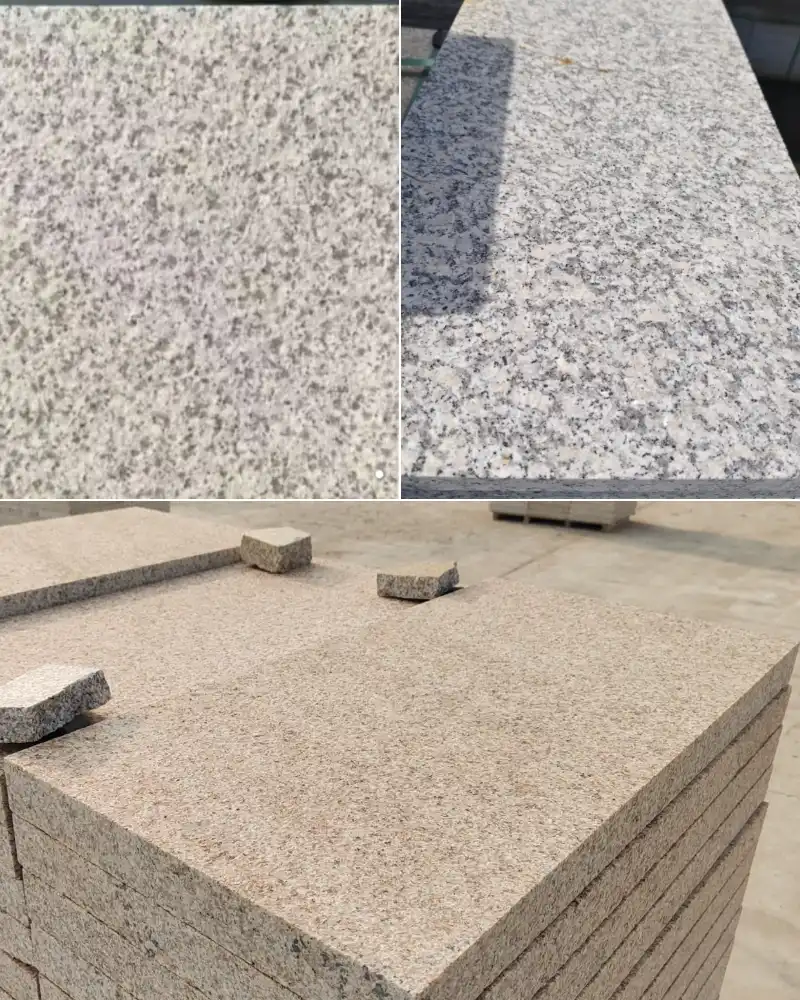 Color Changes: Stone treated with flamed finish will appear whiter. In some stones (such as G682), the internal iron oxidizes after flamed finishing, causing the color to change from yellow to light red.